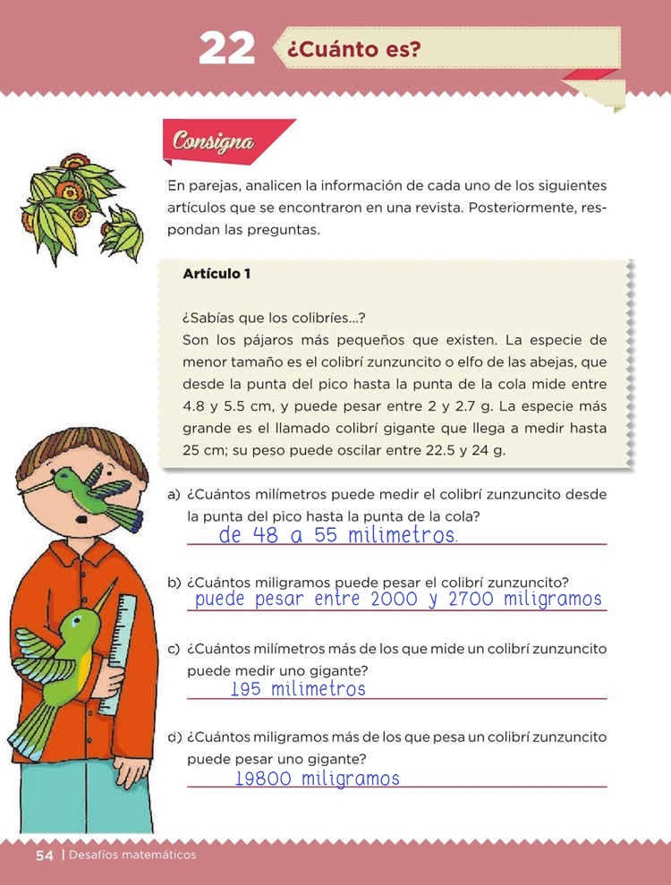 La primera pregunta acerca del artículo 1: Puesto que la longitud del colibrí zunzuncito va de 4.8 a 5.5 cm, cualquier respuesta comprendida en este intervalo es correcta.